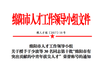 于少波董事長榮獲第十批“綿陽市有突出貢獻(xiàn)的中青年拔尖人才”榮譽(yù)稱號