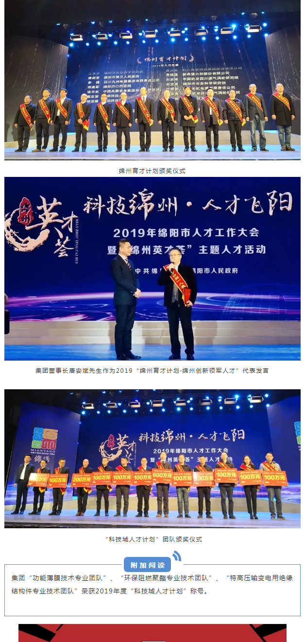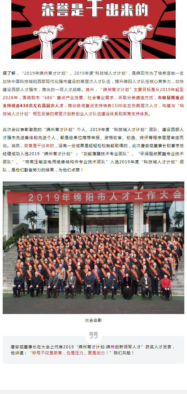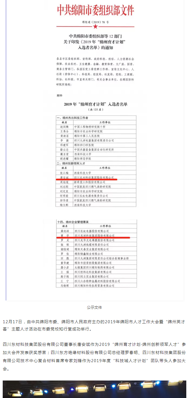 12月10日,綿陽(yáng)市市委組織部等12部門聯(lián)合發(fā)布《關(guān)于印發(fā)2019年“綿州育才計(jì)劃”入選者名單的通知》(綿組通〔2019〕78號(hào)),公示了14類125名入選者名單,公司董事長(zhǎng)唐安斌成功入選2019“綿州育才計(jì)劃·綿州創(chuàng)新領(lǐng)軍人才”, 總經(jīng)理曹學(xué)成功入選2019年“綿州育才計(jì)劃·綿州企業(yè)管理菁英”。